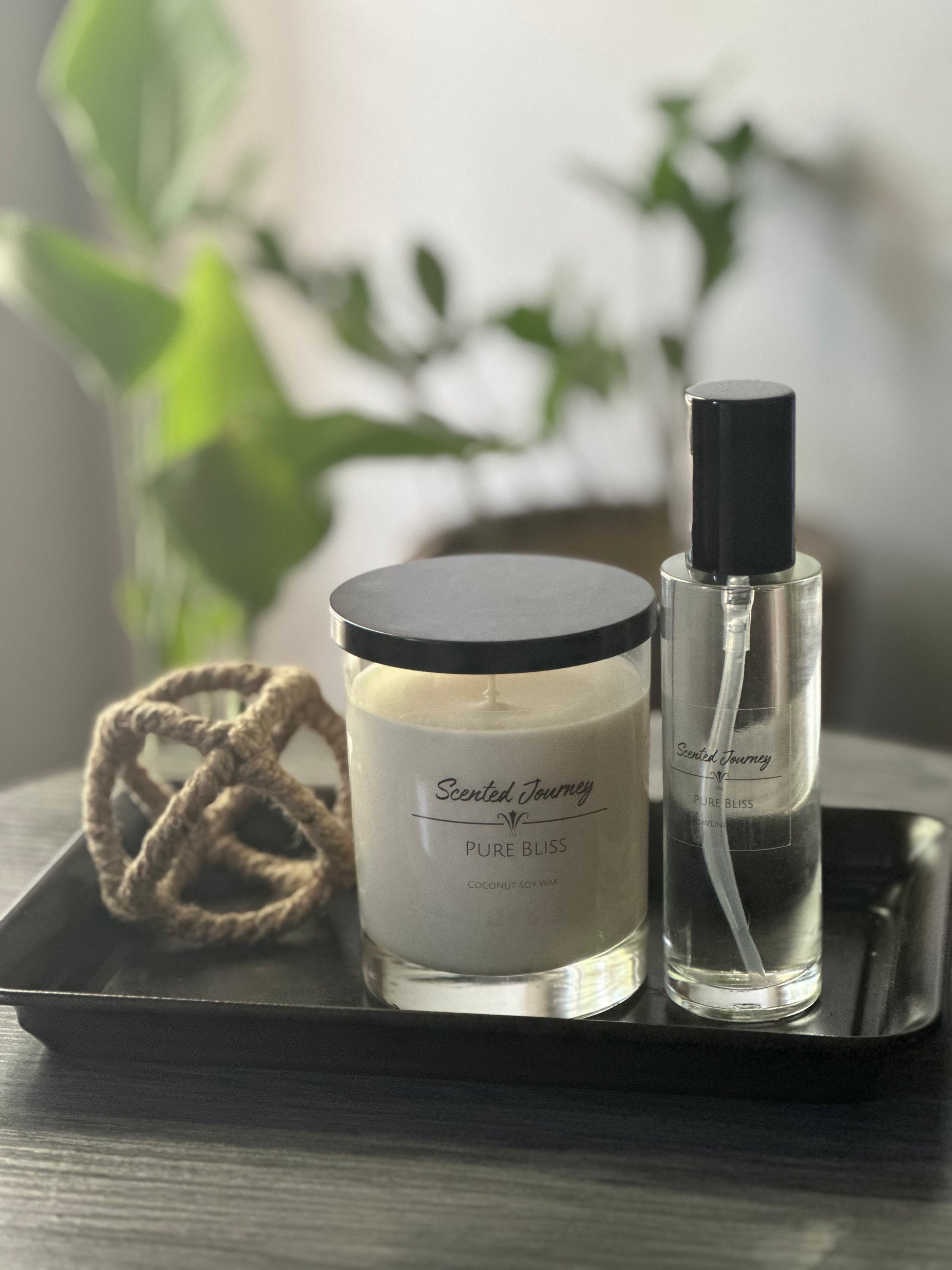 3.4 oz room/linen spray to refresh your space and linen. Also pair spray with candle to enhance your scented journey.